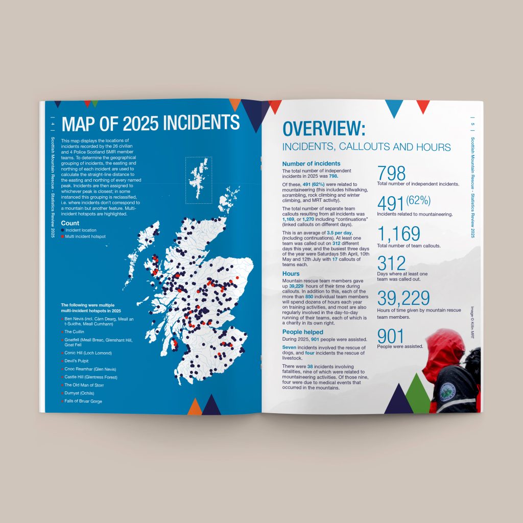 In 2025 Scottish Mountain Rescue member teams attended 798 independent incidents, assisting 901 people in Scotland’s outdoors. The total number of separate team call outs was 1,270 – which includes linked call outs on different days.