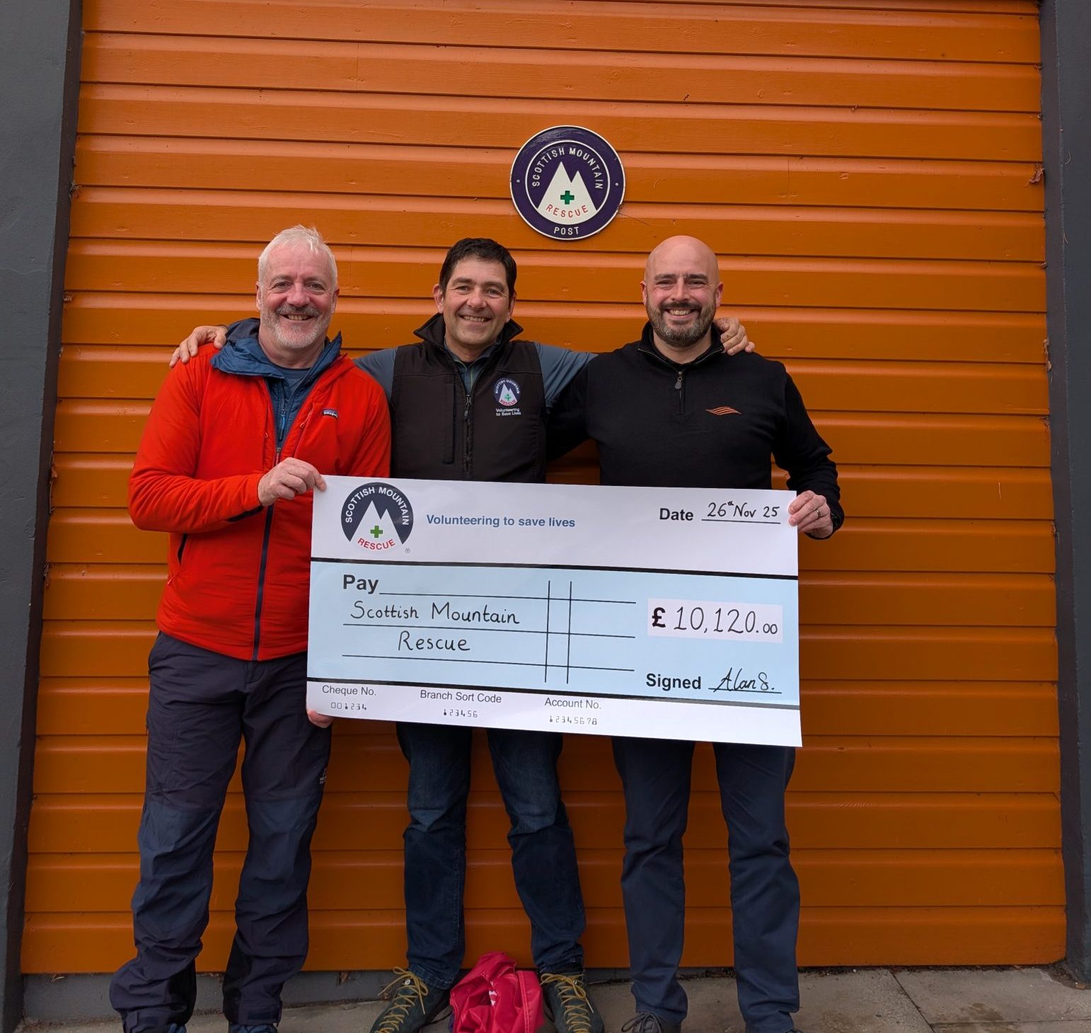 Image: Glenmore Lodge MRT members George and Bill accept Alan’s donation on behalf of Scottish Mountain Rescue